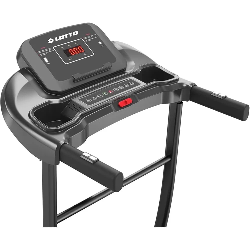 LOTTO OPTIMA • Електрична трака за трчање со мотор од 1.25 коњски сили • Површина за трчање 110×40 cm • Максимална тежина на корисник 100 kg • Брзина на трчање 1-10км/ч • ЛЦД екран со осветлување • Функции на компјутерот за мерење: 12 пресетирани персонализирани програми • време • брзина • дистанца • калории • срцев пулс • маснотии во телото • Можност за поврзување преку Bluetooth со Kinomap • Fit Show и Zwift апликации • Автоматски систем на подмачкување • Рачно прилагодување на наклонот • Safety функција – магнетен клуч кој овозможува итно запирање на уредот • Доаѓа 95% асемблирана • Вградени тркалца • Димензии во склопена состојба 148.5×64.5×118 cm • Тежина 29кг