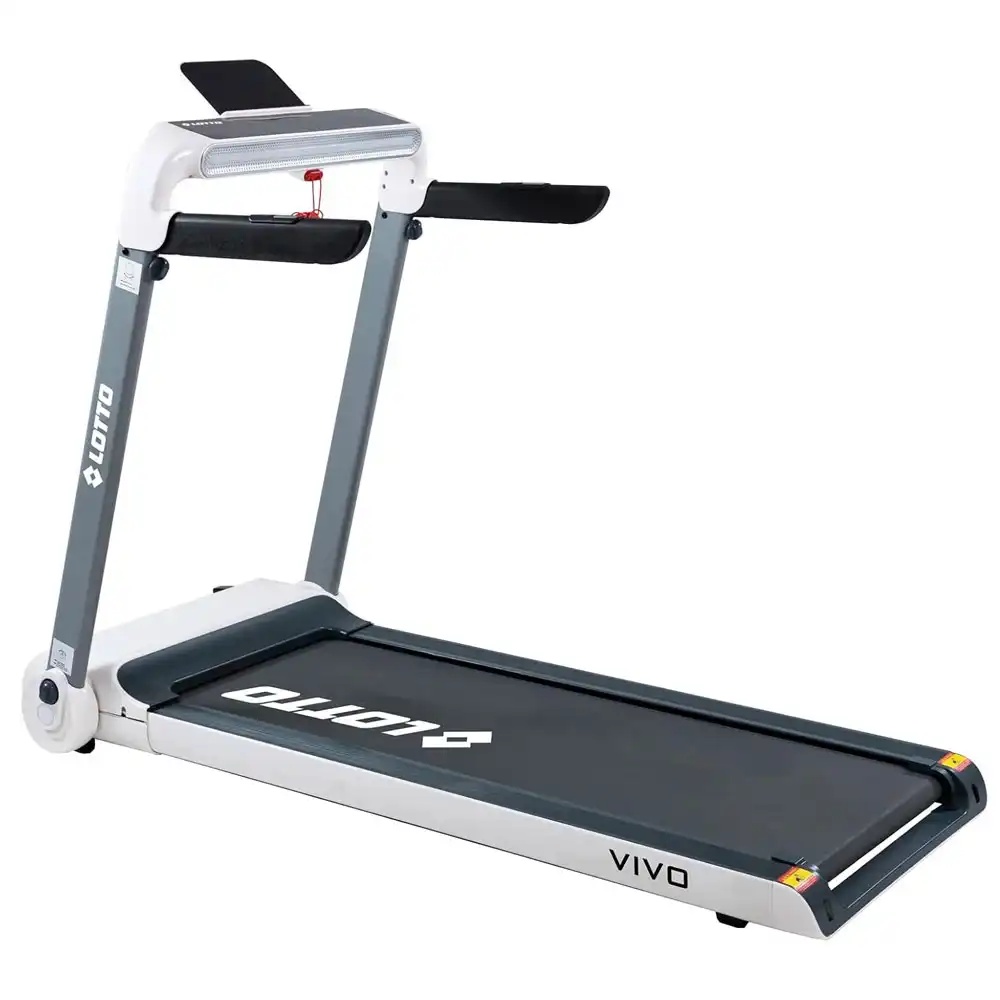 LOTTO VIVO • Електрична трака за трчање со мотор од 2.5 коњски сили • Бела боја • Површина за трчање 121×46 cm • Максимална тежина на корисник 120 kg • Автоматско прилагодување на наклонот на 15 нивоа • Брзина на трчање 1-15км/ч • ЛЦД екран со осветлување • Функции на компјутерот за мерење: Време • брзина • дистанца • калории • срцев пулс • маснотии во телото • Можност за поврзување преку Bluetooth со Kinomap и Zwift апликации • Автоматски систем на подмачкување • Safety функција – магнетен клуч кој овозможува итно запирање на уредот • Доаѓа 95% асемблирана • Вградени тркалца • Димензии во асемблирана состојба 156.7x77x119.5 cm • Тежина 60кг