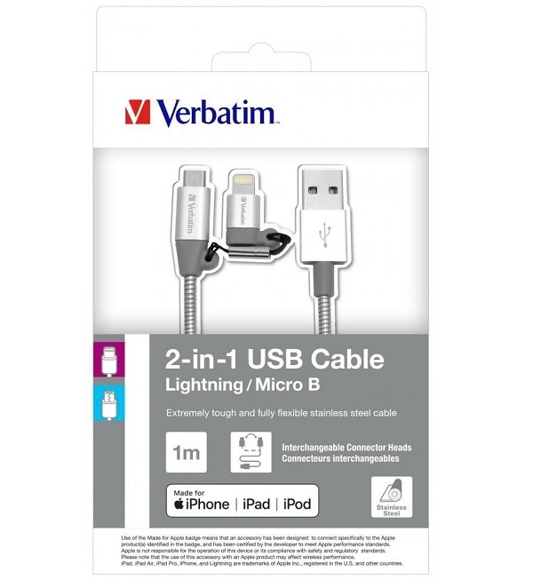 Verbatim 2-in-1 Lightning + Micro B USB Stainless Steel Sync & Charge Cable